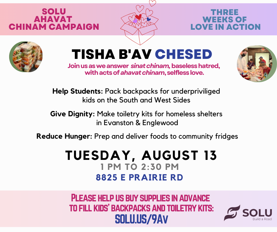 Join Solu for our annual Tisha B'av Chesed Projects – as we spread acts of Ahavat Chinam, selfless love, around our city.